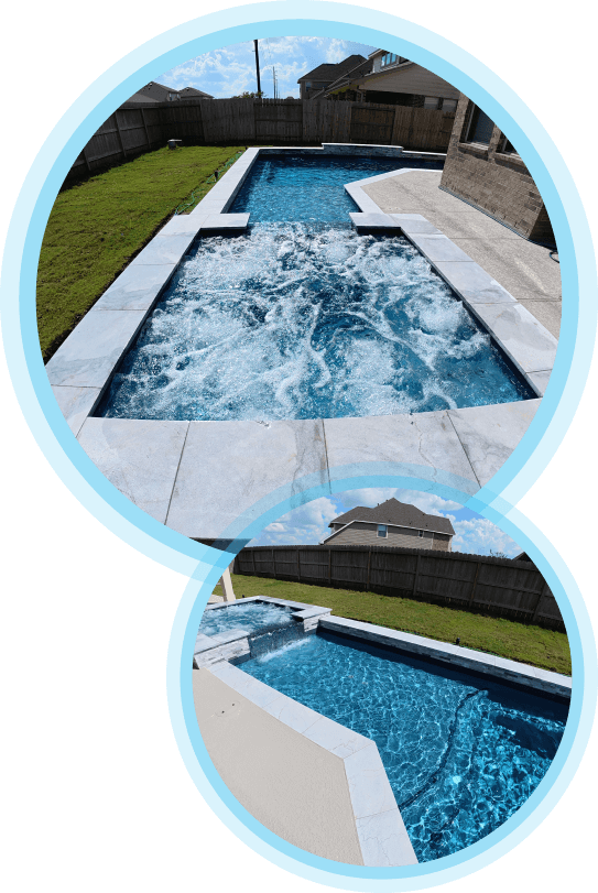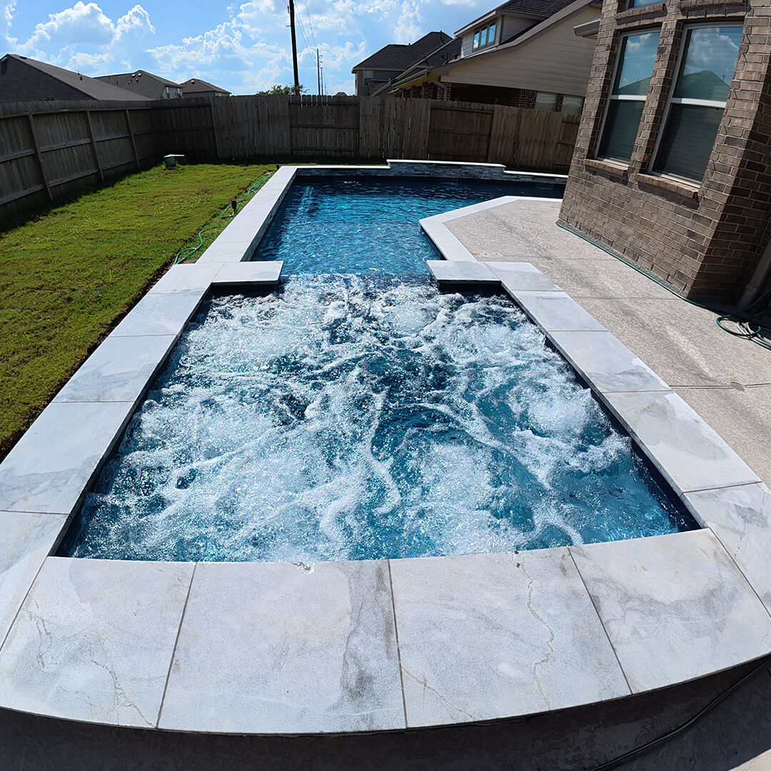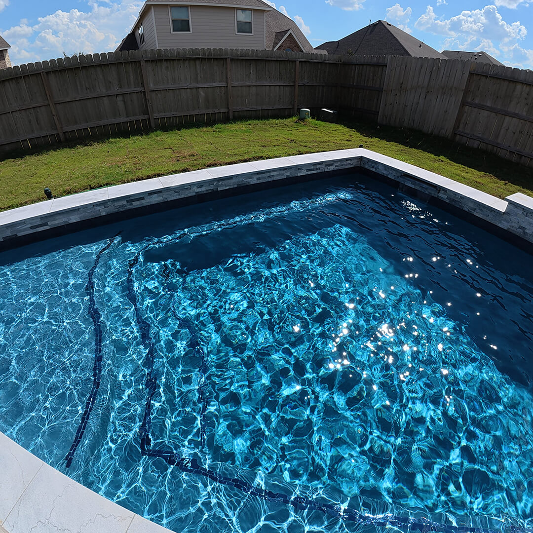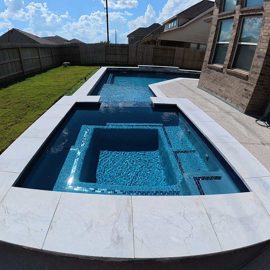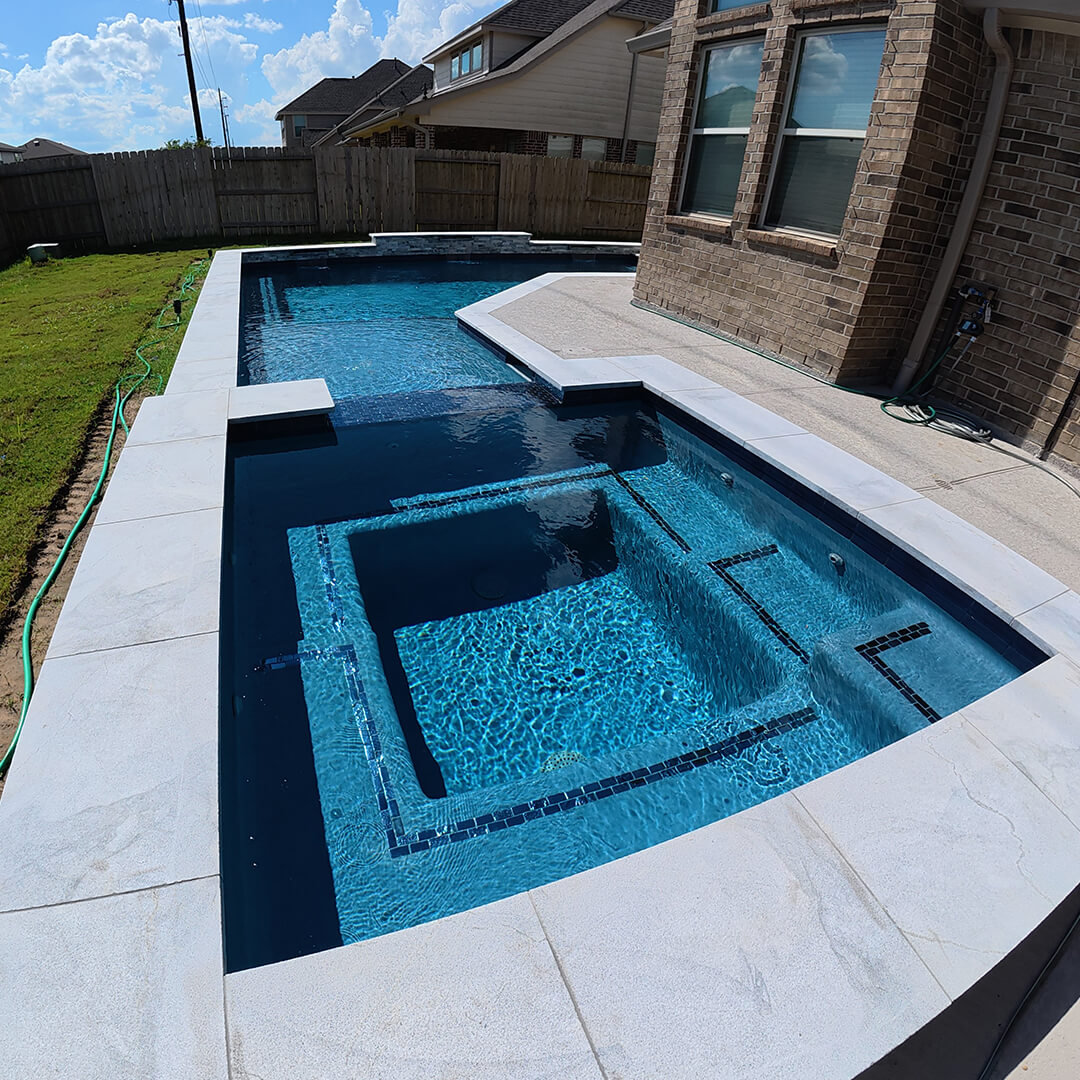 The Forkin family’s backyard was transformed into a modern outdoor retreat with a striking geometric pool and spa design. The Barbados Blue QuartzScapes plaster brings a deep, reflective water color that enhances clarity and creates a bold visual impact. Navy Blue 6″ waterline tile, accented along steps and benches, provides both definition and contrast, while black mosaic toe tiles add safety and a sleek, modern detail.