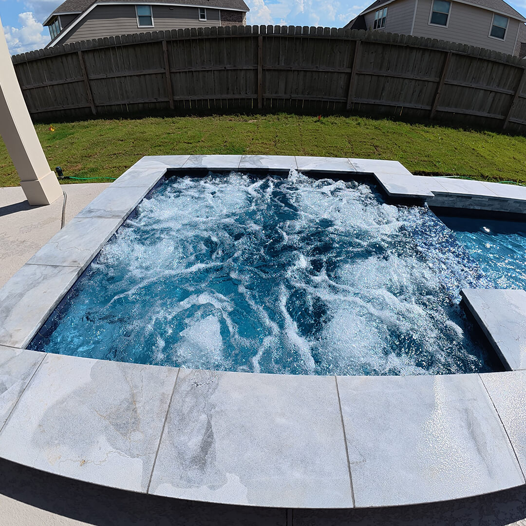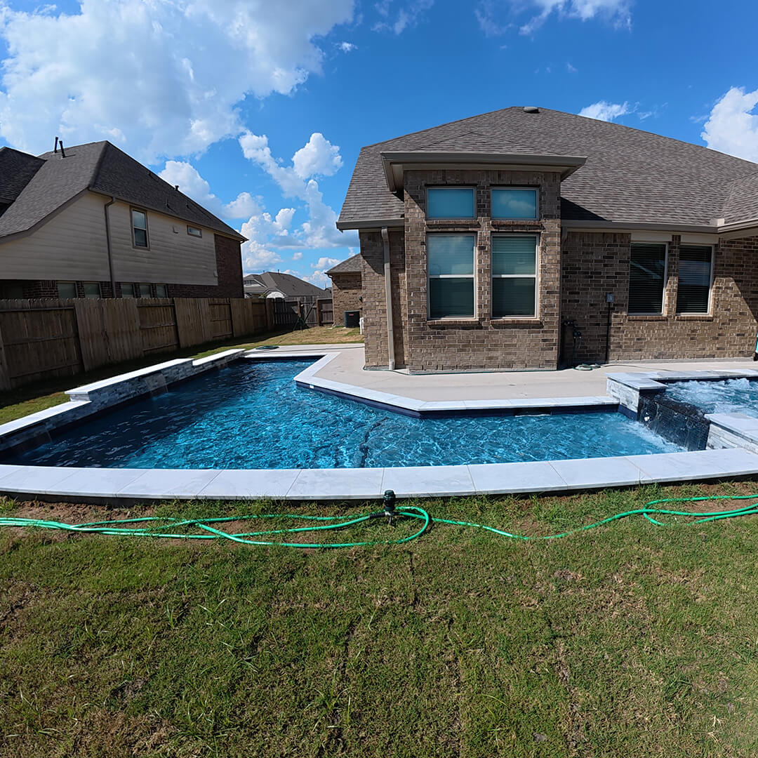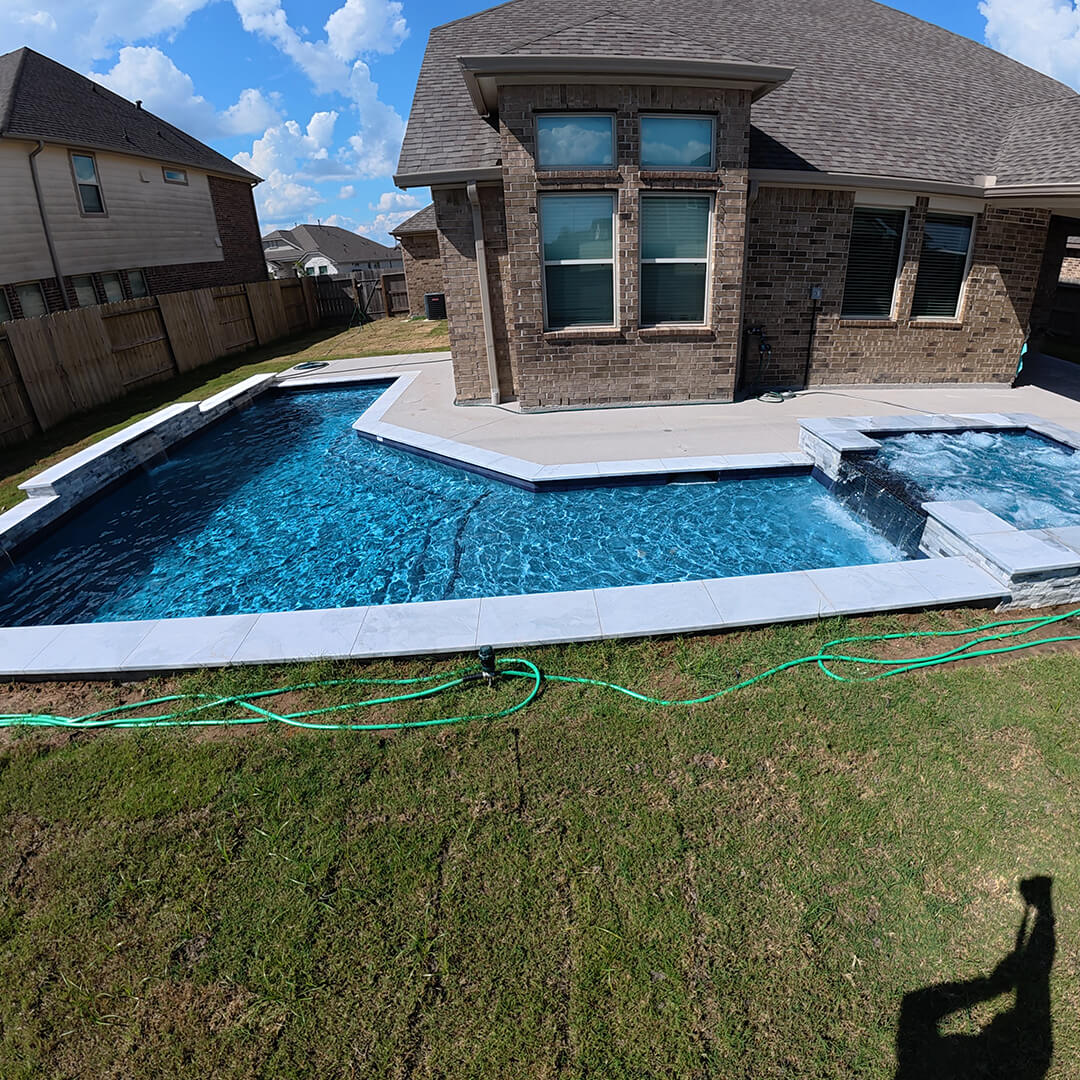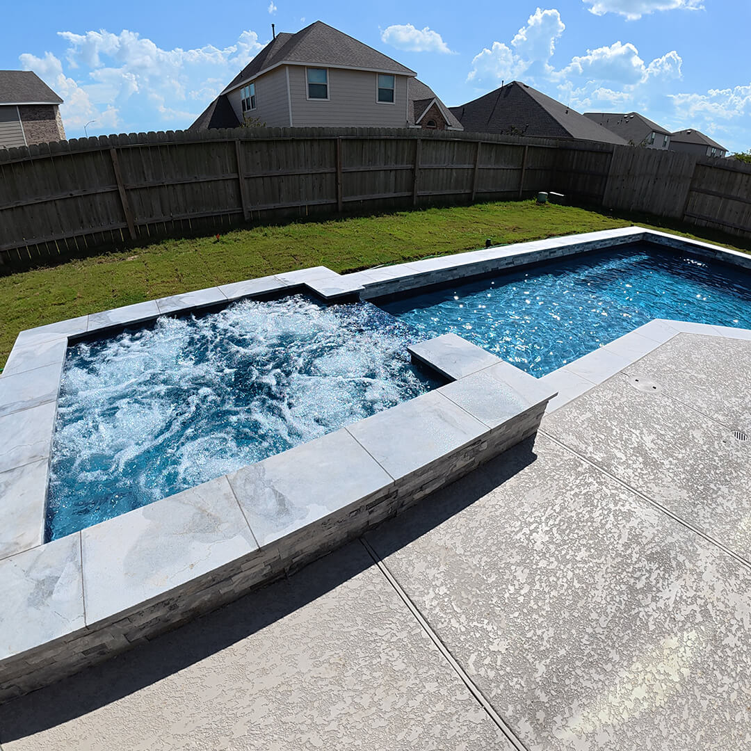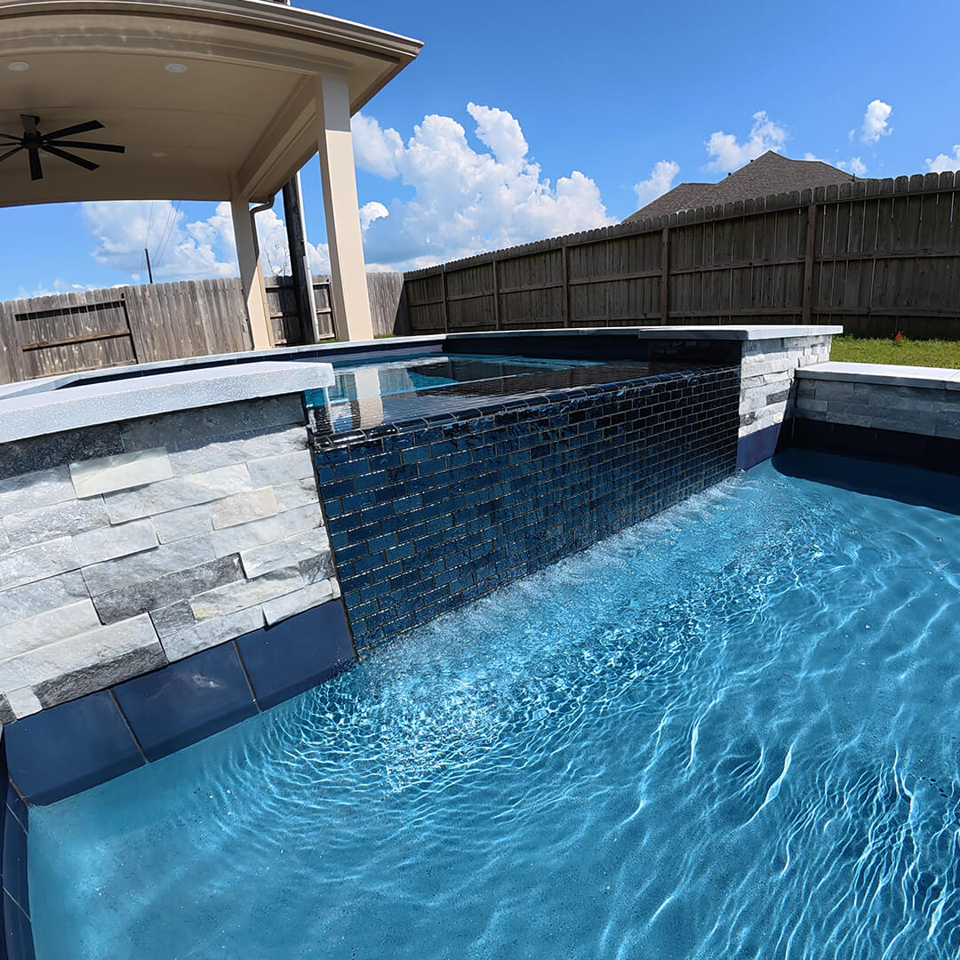 To enhance texture and dimension, the raised spa and wall are finished in Silver Ledger Stone, tying together the design with a luxurious natural accent. Waterfalls integrated into the raised wall add calming sound and motion, balancing the bold blue water with tranquil sensory effects. The spa spillover creates a smooth connection to the pool, while the clean Belfonte Sandblasted coping frames the layout with a light, refined edge.