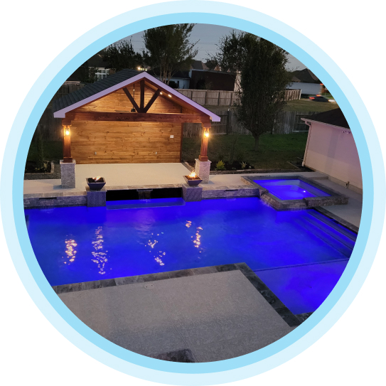 The Hammons Family found us via google and were initially looking to receive a design and quote by us to review and compare them to the rest that they previously received. Out of all the quotes that the Hammons family received and reviewed we were selected to move forward with the project. Once moving forward, we then had the homeowners start with making material selections that they liked, and all flowed together nicely with the setting of the backyard. Overall, the family was great to work with as there was communication through the whole process. We also had to obtain a permit for the new construction pool and patio cover before moving forward with the work. The project consisted of a pool and spa combo, geometric shape, huge tanning ledge, a raised wall that was leveled to the deck in the back,2 columns on raised wall,2 fire bowls placed on the columns,2 scuppers, spa spill way leading into the pool, 6 pool lights and 1 spa light that change colors, Plaster stone scapes- Aqua blue. As for the patio cover, there is a privacy wall on the back to install a tv in the future, 4 lights on the inside, 1 fan, 2 lights on the outside post, and stack stone to the bottom half of the post. Spray deck around the area, and landscaping package.
