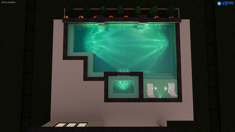 Raised walls—one 12″ high and 20′ long, and another 18″ high and 10′ long—are enhanced with two 2′ x 2′ decorative columns and five 24″ scuppers, adding dimension and elegance. A pebble finish, two bubblers, two deck jets, four lights, and two skimmers create a tranquil ambiance. The 450 SQFT Concrete offers ample outdoor space, while the Wi-Fi-enabled VSF pump and cartridge filter provide modern convenience and effortless maintenance.