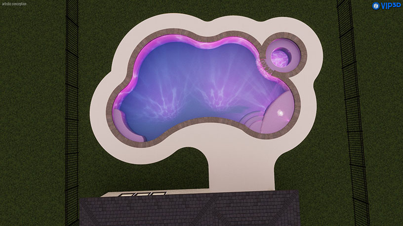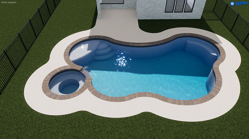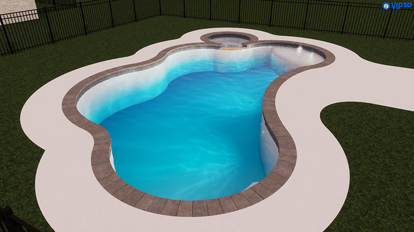 A 28′ raised wall with three 24″ scuppers adds visual interest and elegance to the design. The pool’s pebble finish, along with one bubbler, four lights, and two skimmers, creates a serene and inviting atmosphere. The 450 SQFT Concrete spray deck offers plenty of space for outdoor enjoyment, while the Wi-Fi-enabled VSF pump and cartridge filter ensure easy maintenance and modern convenience.